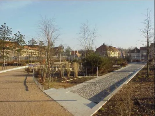 La reconversion a reposé sur la dépollution, la création de sols perméables et la plantation d’arbres et de prairies urbaines. L’eau de pluie est désormais gérée en surface, favorisant l’infiltration.