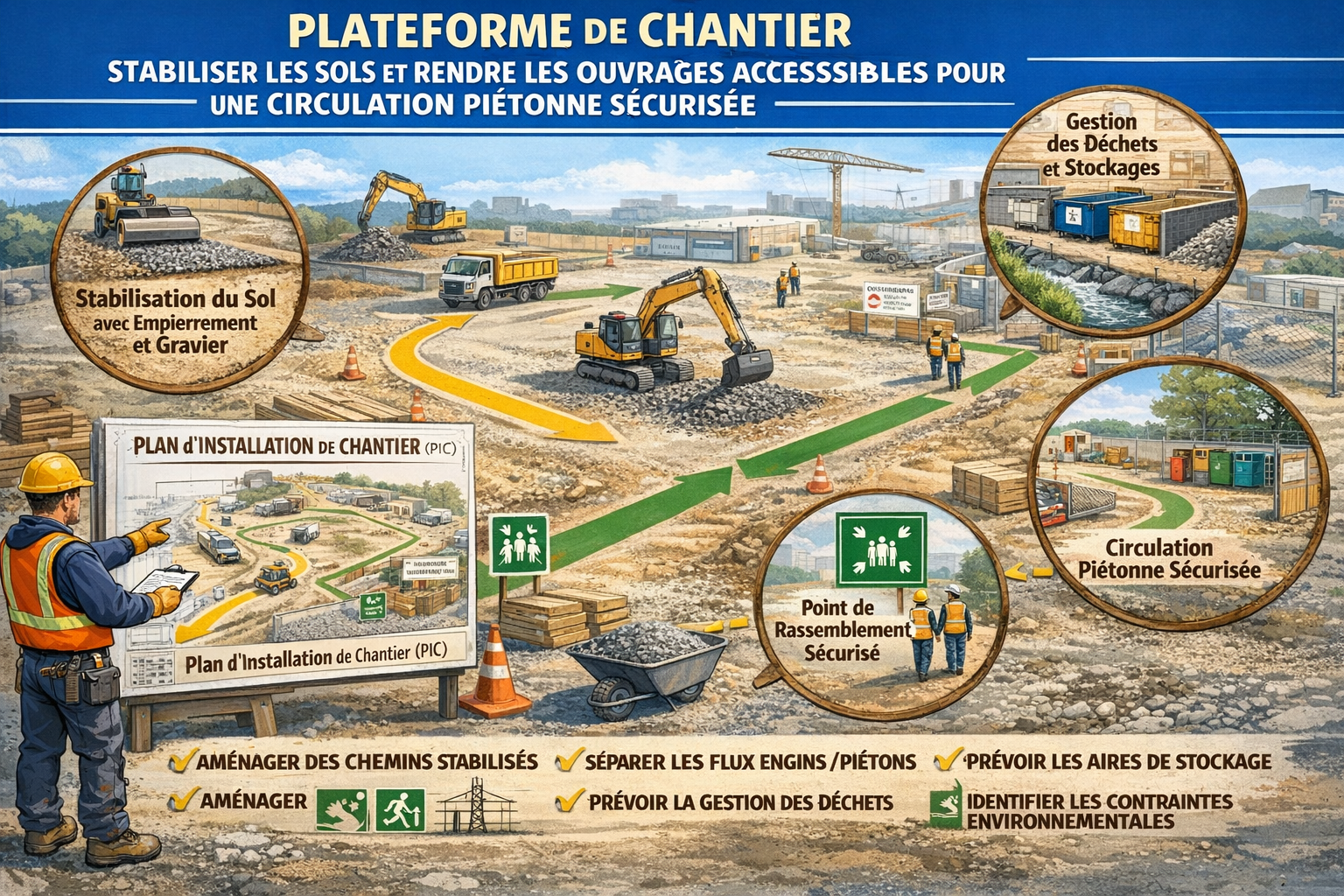L’aménagement d’une plateforme de chantier est une étape fondamentale pour le bon déroulement des travaux de construction. Ce processus englobe l’organisation des accès engins, camions, piétons, base vie, stockage, approvisionnements , des matériaux et la gestion des déchets. L’objectif est de créer un espace de travail organisé et sécurisé, tout en séparant les flux de circulation engins/piétons, en intégrant les contraintes environnementales et réglementaires.