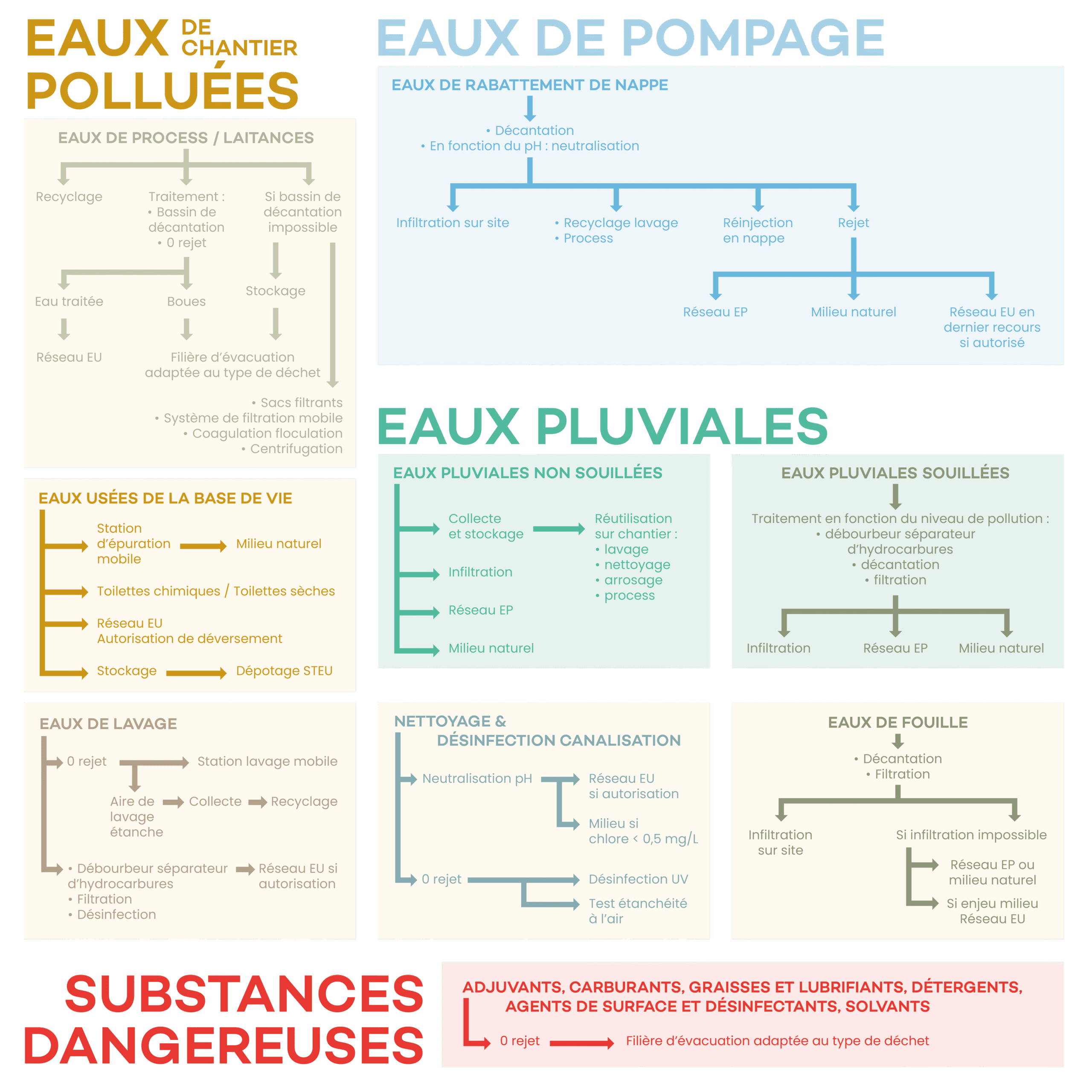 Une bonne organisation du chantier aide à collecter séparément les effluents selon leur niveau de pollution, les nécessités de traitement et les possibilités de rejet :