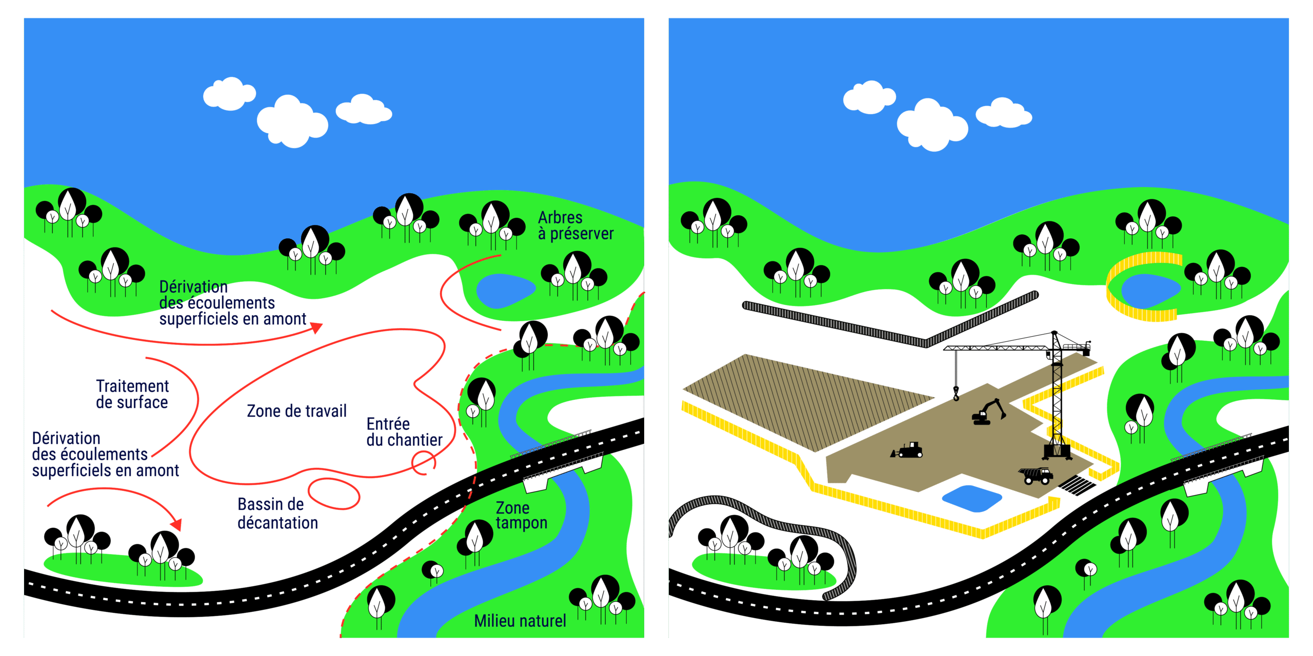 - L’approche multi-barrières et les solutions de moindre impact permettent de réduire à la source les volumes d’eau à traiter et de limiter les impacts des rejets de chantier.