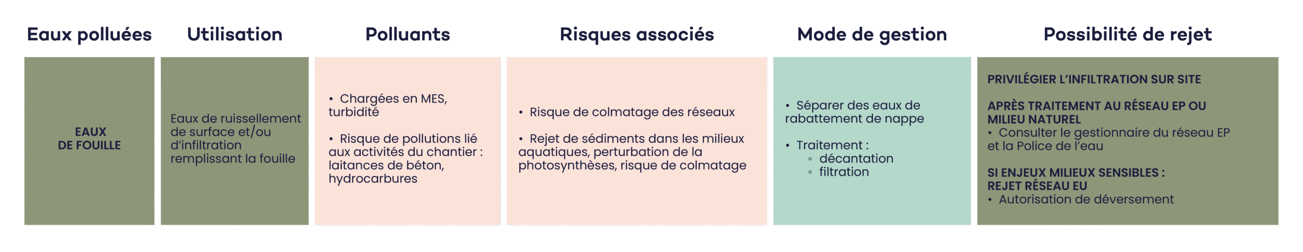 - Les chantiers génèrent plusieurs types de rejets : eaux de rabattement de nappe, eaux de fouille chargées en sédiments, eaux de ruissellement souillées, laitances de béton, eaux de lavage et eaux usées des bases de vie.