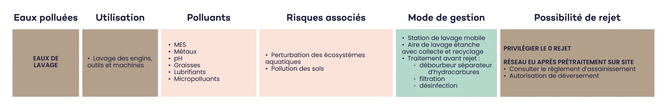 Le recyclage des eaux de lavage et les techniques zéro rejet sont à privilégier : station de lavage mobile, aire de lavage étanche avec collecte et recyclage des effluents.