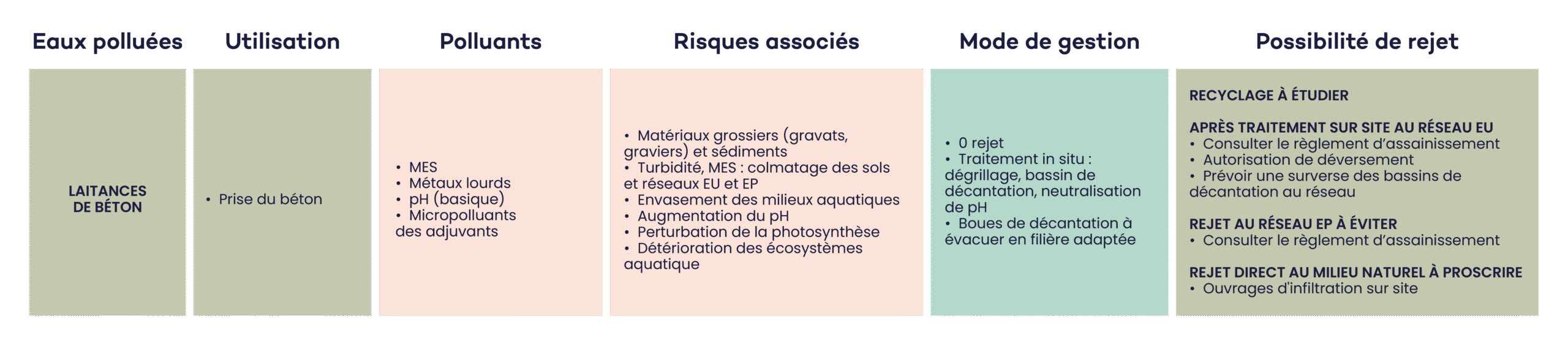 - Rejet au milieu naturel superficiel des eaux issues du traitement des laitances à proscrire : présence de métaux et micropolluants (adjuvants).