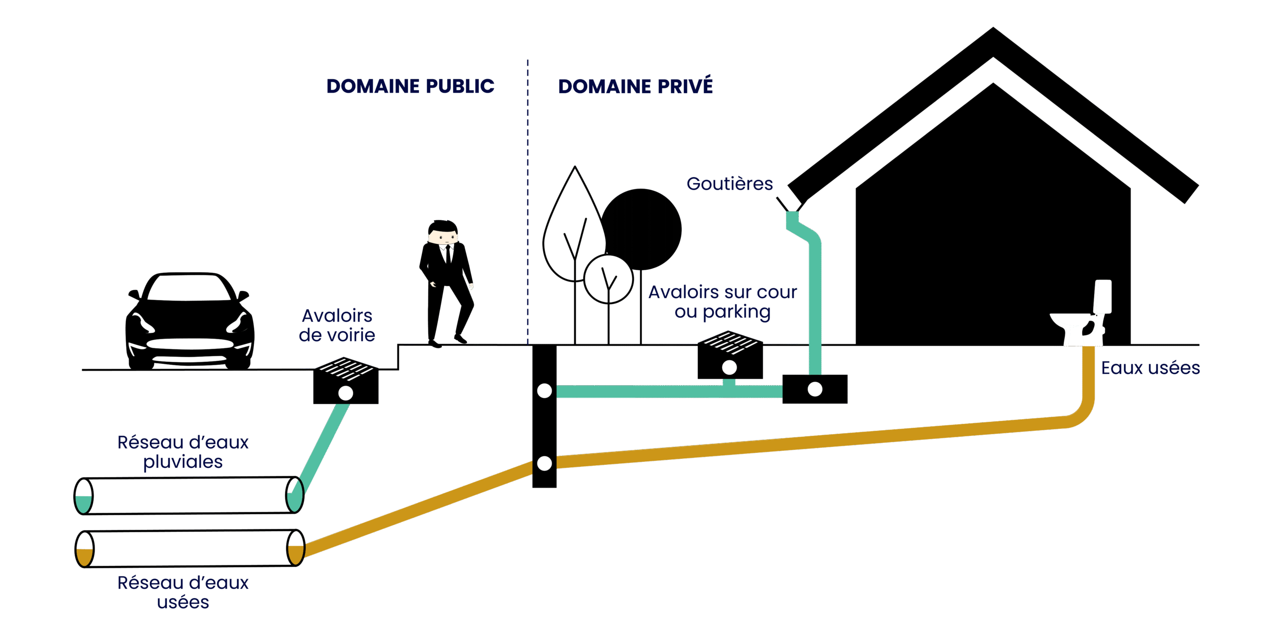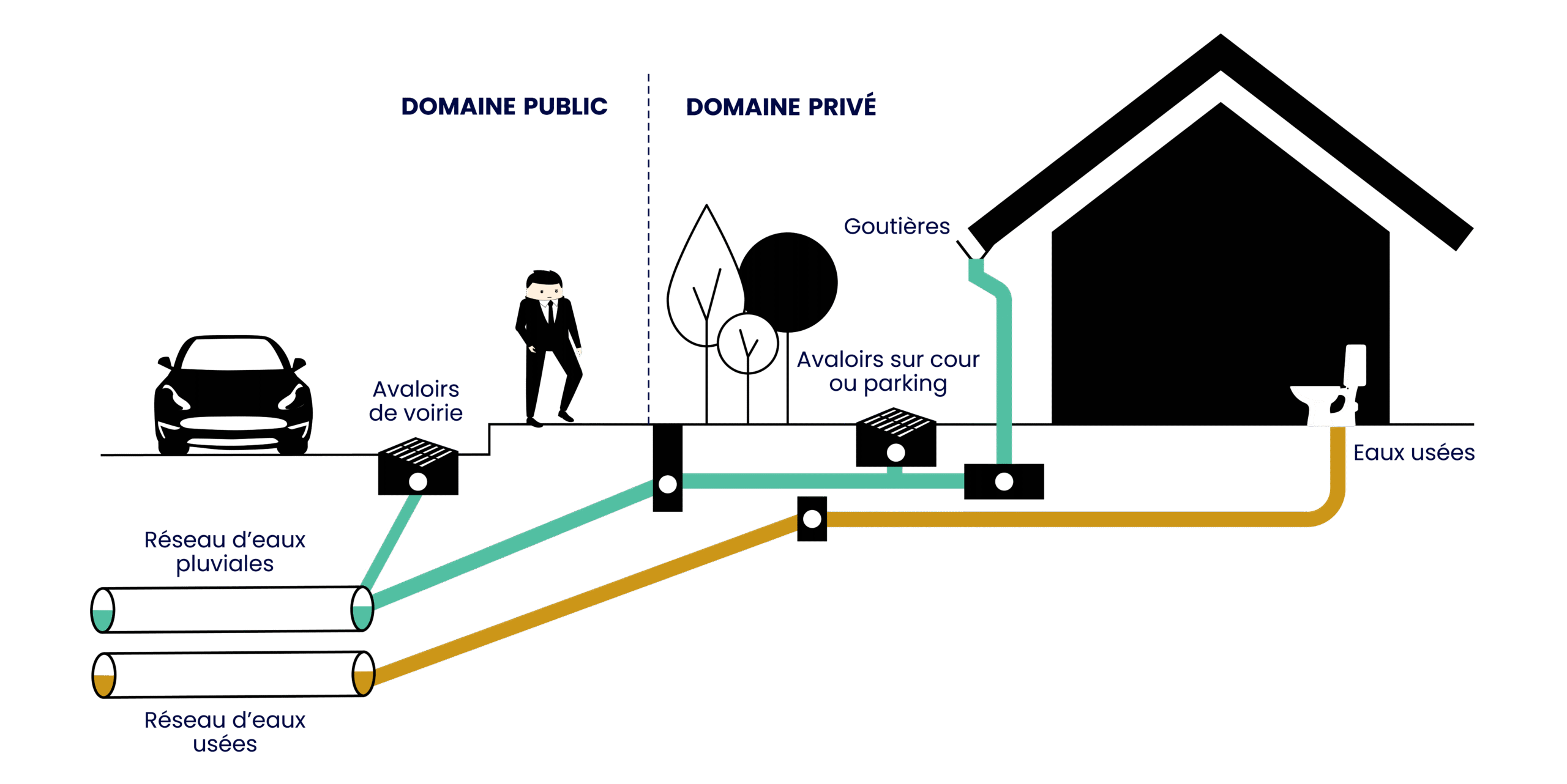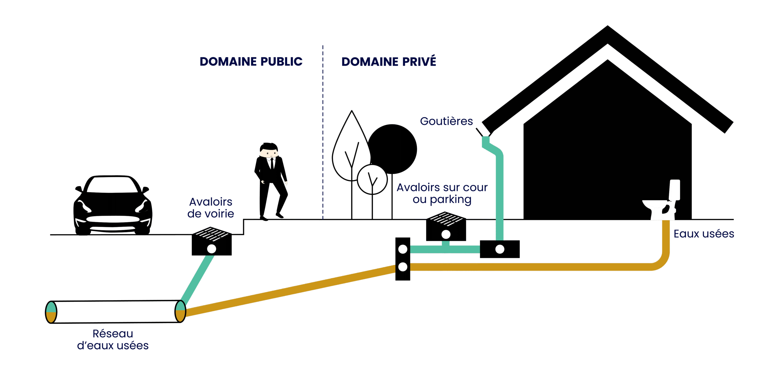 La première canalisation permet l’évacuation vers la station d’épuration des eaux usées strictes et des eaux pluviales provenant du domaine privé. Le particulier ne possède qu’un regard de branchement.