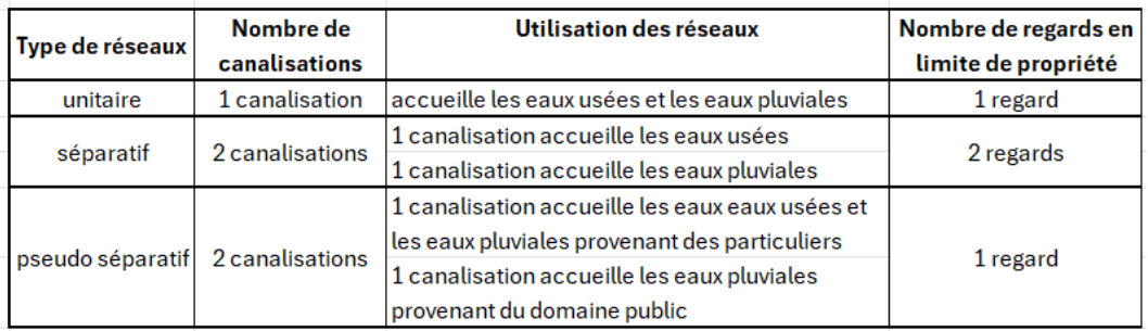 Ces types de réseaux sont équipés de deux tuyaux. Les particuliers sont équipés de deux regards de branchement.