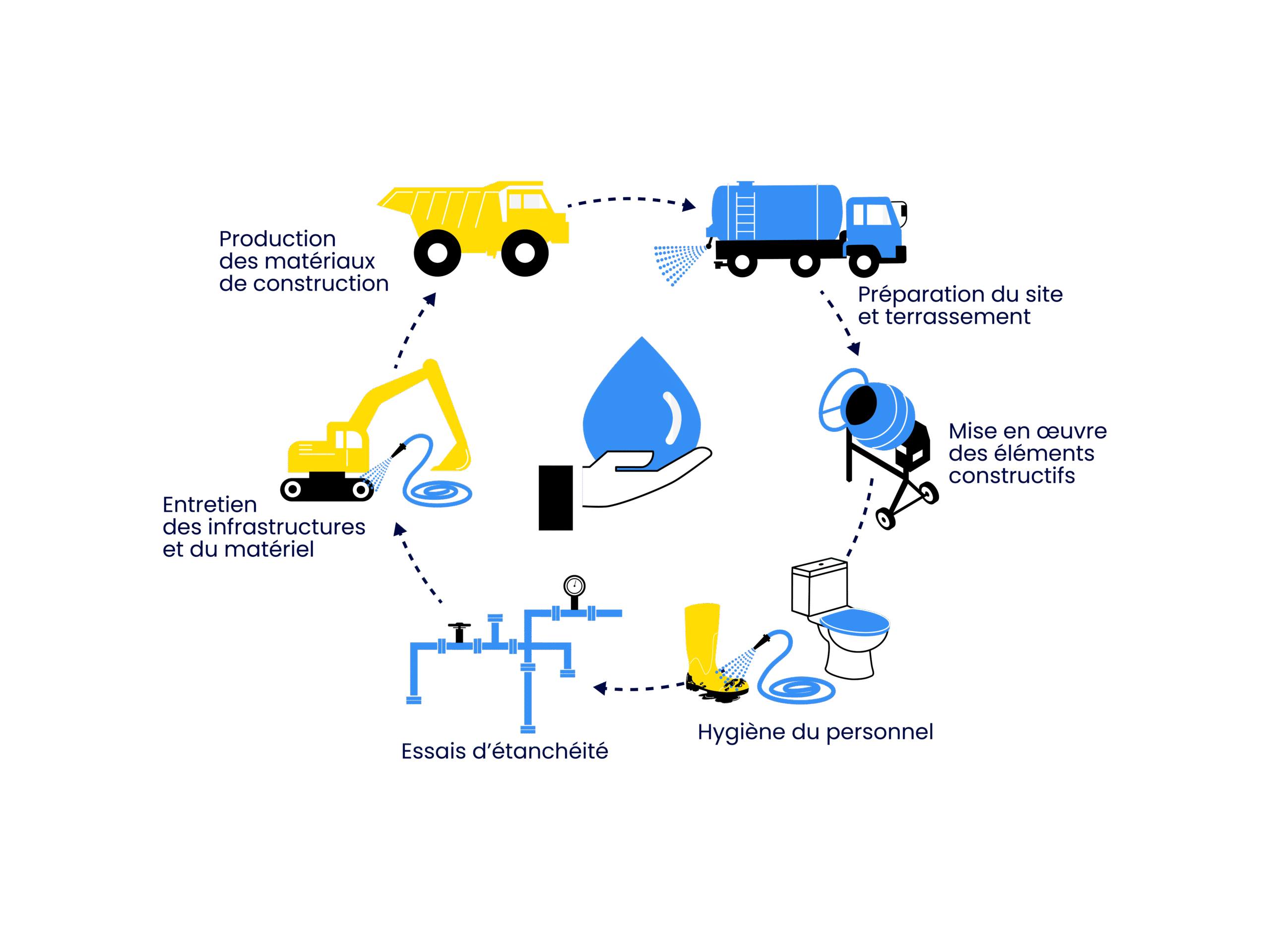 - La bonne gestion de l’eau sur un chantier TP passe d’abord par l’identification des usages de l’eau. Les principaux postes concernés sont l’arrosage, le compactage, le nettoyage des engins et la base vie.