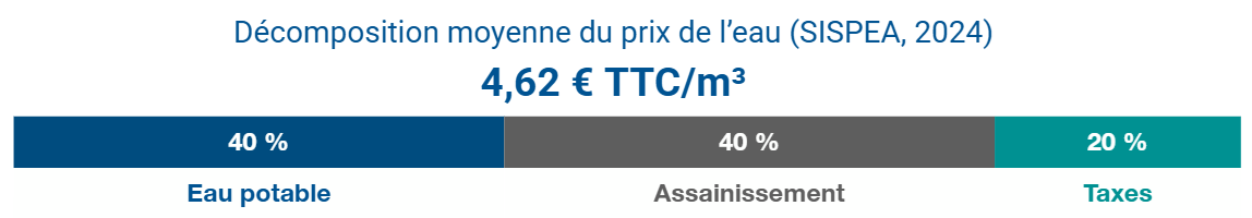 En moyenne, la facture annuelle pour les ménages s’élève à 540 € TTC/an pour l’eau potable et l’assainissement. Selon l’ADEME, entre 2012 et 2022, le prix de l’eau et de l’assainissement a connu une inflation de 1,6 % par an – sur cette même période, l’inflation a été de 1,3 % par an.