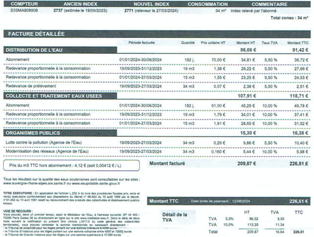 Exemple pour une consommation de 34 m3 : 226,51 € TTC