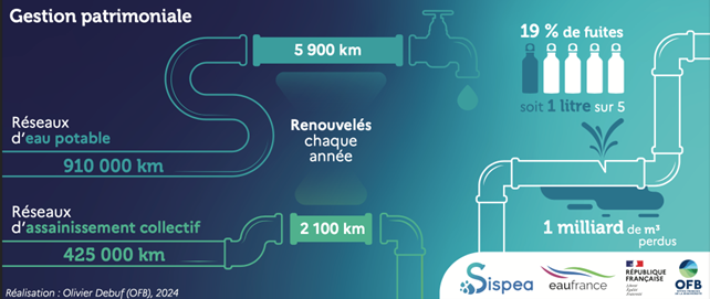 1 Md m3 d’eau sont perdus chaque année en fuite sur les réseaux d’eau potable. Les besoins de financement du renouvellement des réseaux d’eau potable et d’assainissement sont conséquents et les sous-investissements notables. Le traitement des micropolluants (pesticides, résidus de médicaments…) génère d’importants surcoûts pour la production d’eau destinée à la consommation humaine. Au regard de l’évolution des normes sanitaires (par exemple sur les teneurs en PFAS), ces coûts vont continuer à augmenter ces prochaines années.