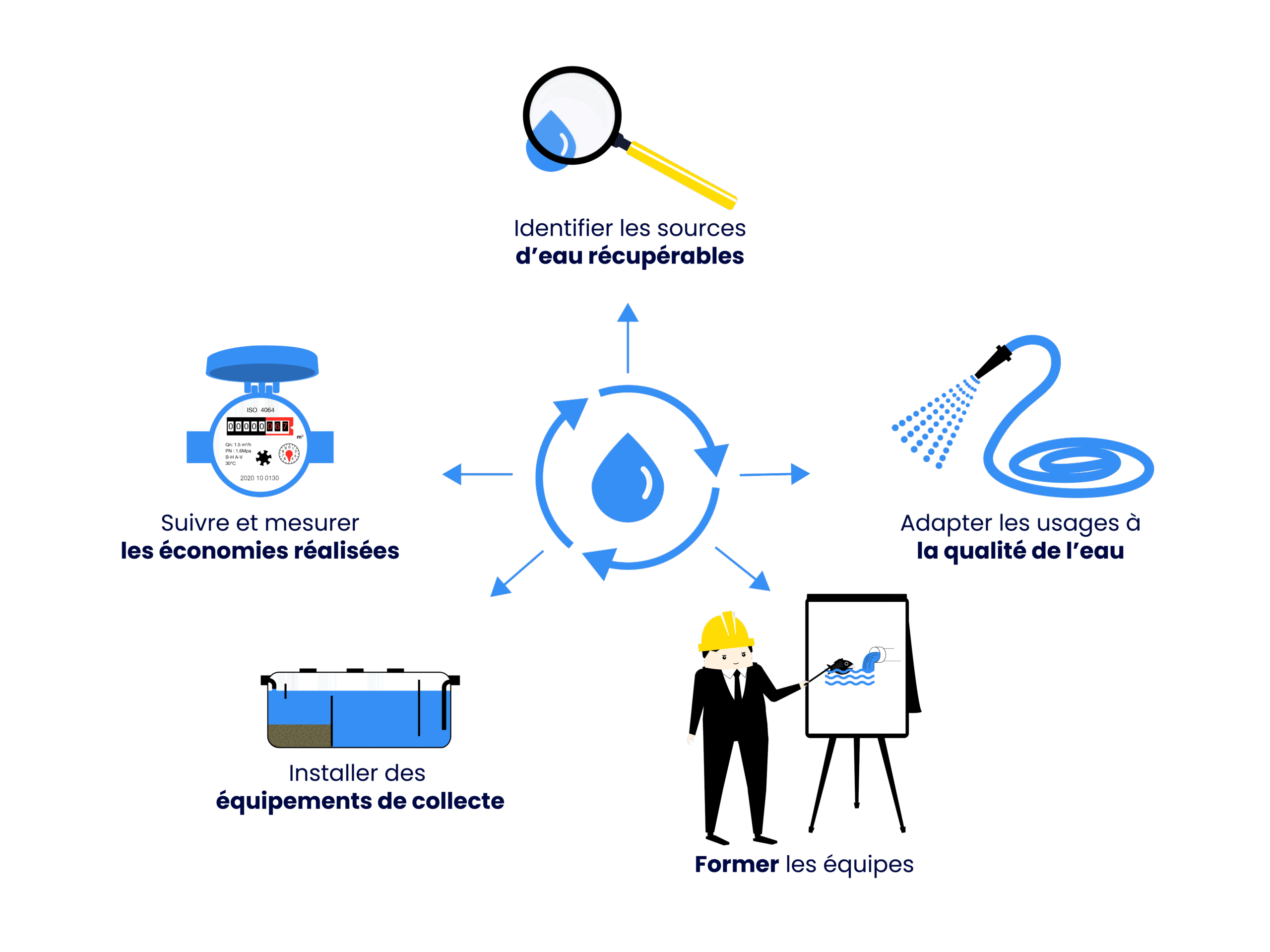 - De nombreuses solutions existent, allant de la récupération des eaux de pluie à la réutilisation des eaux de rinçage ou de pompage.