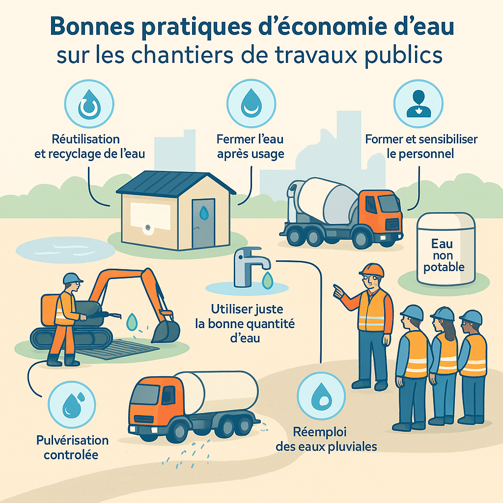 - La réduction de l’impact environnemental des chantiers TP et la préservation des ressources en eau passent par la mise en œuvre d’écogestes simples et de bonnes pratiques d’économies d’eau, comme « couper l’eau le soir » ou « recycler les eaux de lavage ».