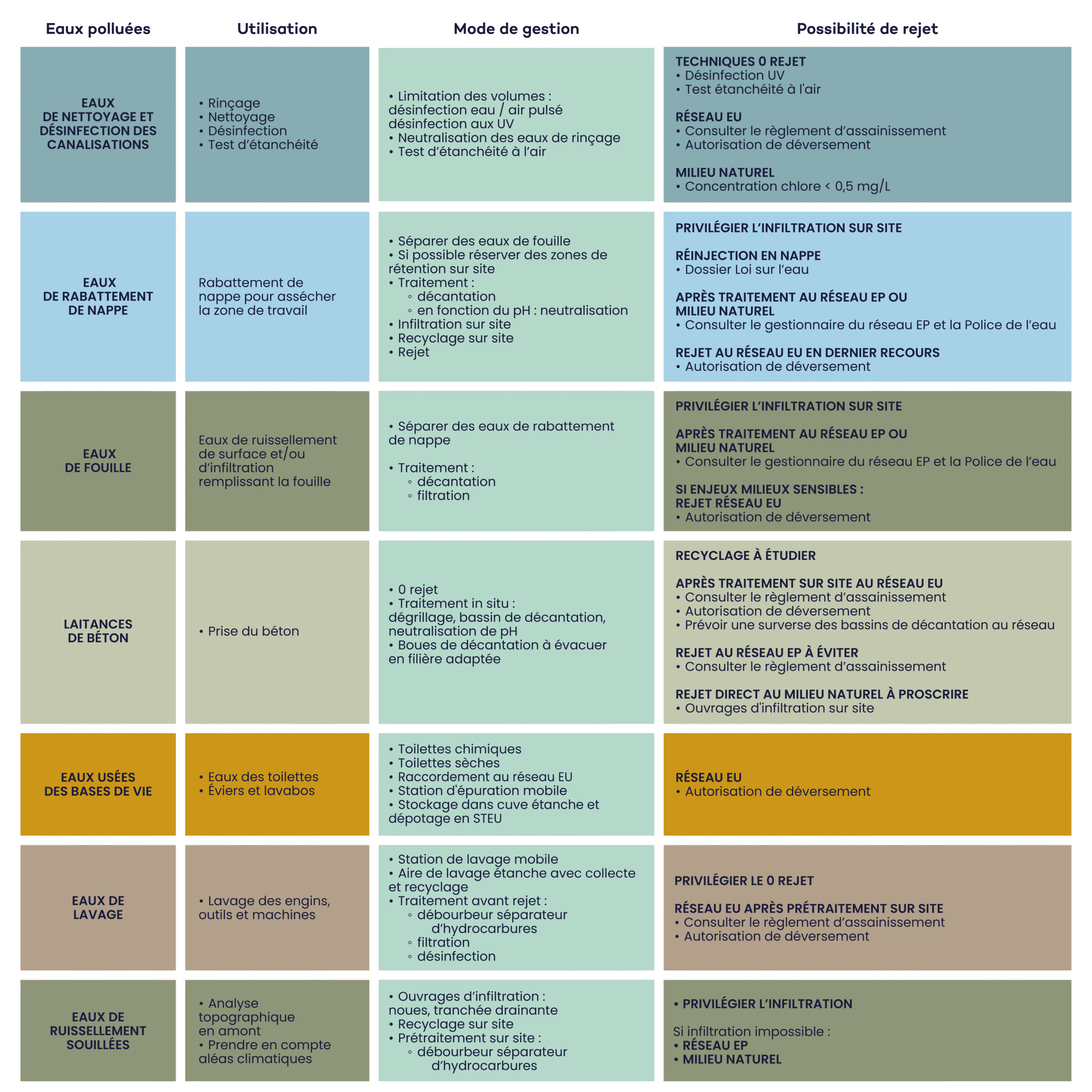 ➤ Les différents types de traitement des effluents avec rejet sont présentés dans la fiche TP-Demain : Le traitement des effluents de chantier.