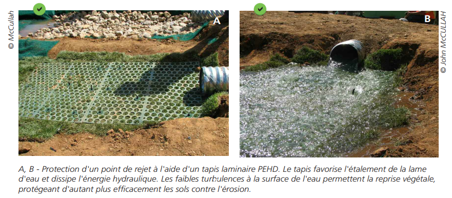 - Création d’un écoulement peu turbulent, favorable à la reprise végétale : raquettes de diffusion, tapis laminaires en polyéthylène haute densité (PEHD).