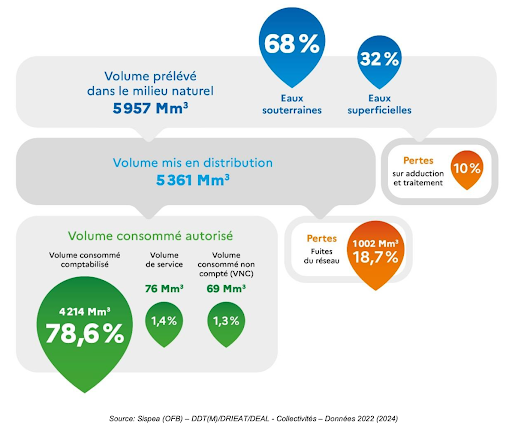 La France compte plus de 10 000 services d’eau potable en 2024 pour environ 27 millions d’abonnés. 5,96 Md m3 d’eau sont prélevés, 5,36 Md m3 mis en distribution et 4,21 Md m3 consommés.