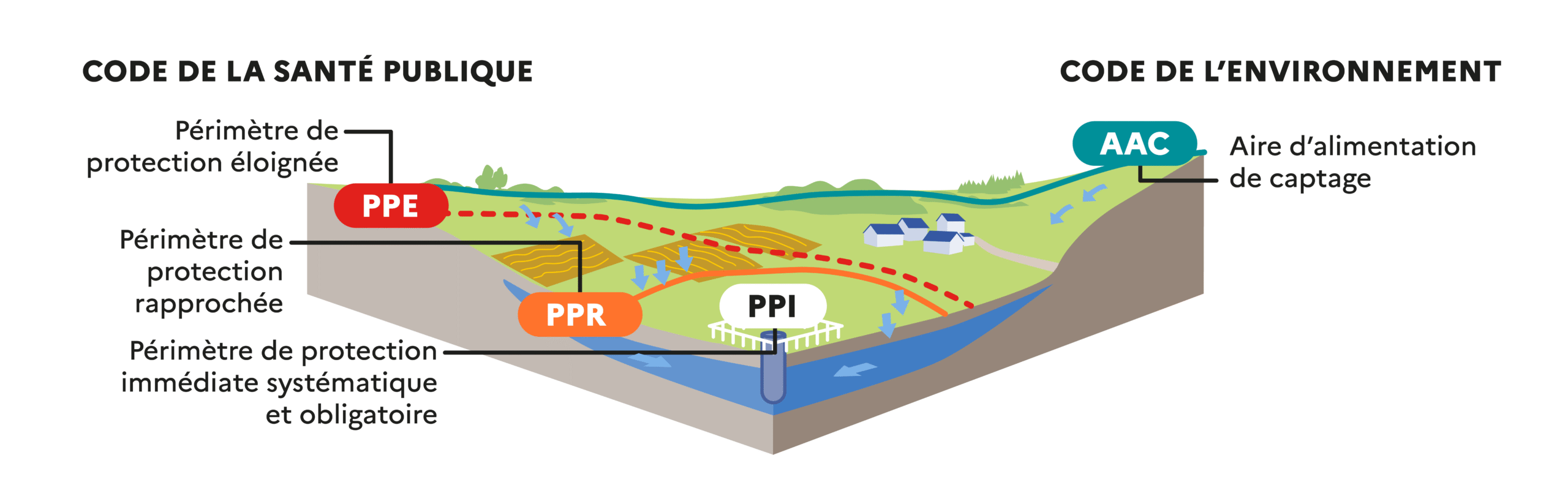 Les périmètres de protection des captages d’eau potable, instaurés en 1964 et définis dans le Code de la santé publique, sont des périmètres réglementés autour des points de captage d’eau potable. Leur principal objectif est de prévenir toute forme de contamination qui pourrait compromettre la qualité de l’eau destinée à la consommation humaine. La division en trois périmètres spécifiques permet une gestion ciblée des risques :