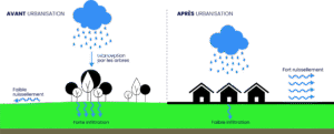 - Augmentation du risque d’inondation : l’eau de pluie ruisselle rapidement vers les systèmes de drainage, qui peuvent être submergés en cas de précipitations intenses, surtout dans les zones denses. Cette surcharge des réseaux entraîne un risque accru d’inondations, particulièrement en périodes de fortes pluies ou d’événements climatiques extrêmes.