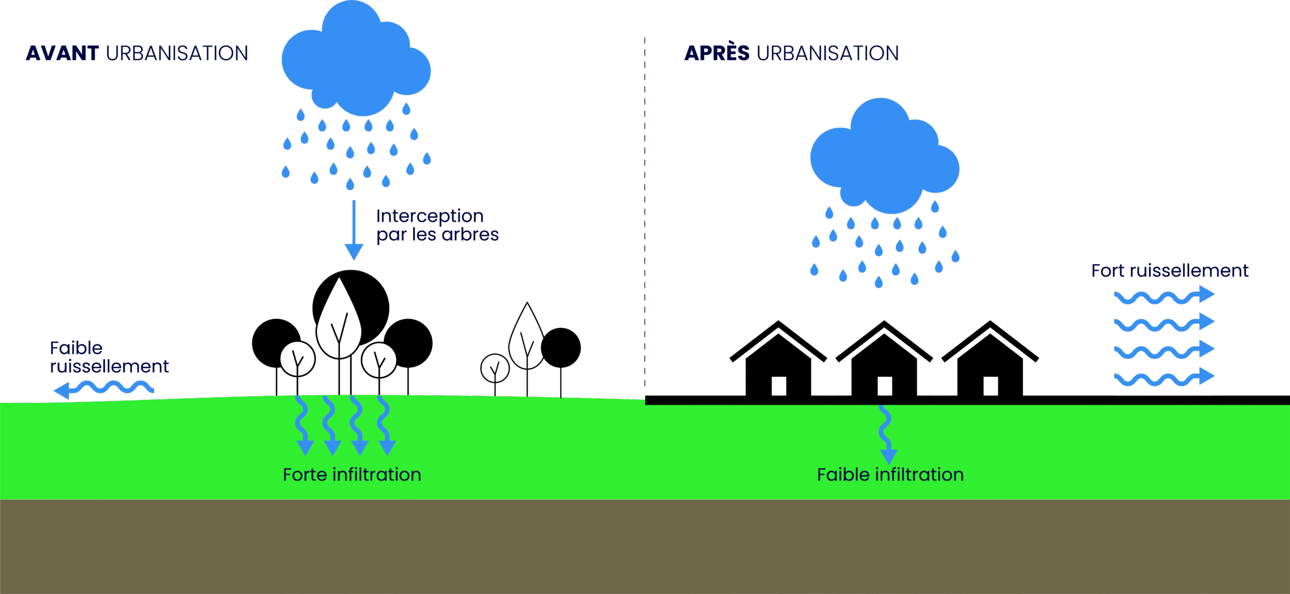 - L’augmentation des risques d’inondation : l’eau de pluie ruisselle rapidement vers les systèmes de drainage, qui peuvent être submergés en cas de précipitations intenses, surtout dans les zones denses. Cette surcharge des réseaux entraîne un risque accru d’inondations, particulièrement en périodes de fortes pluies ou d’événements climatiques extrêmes.