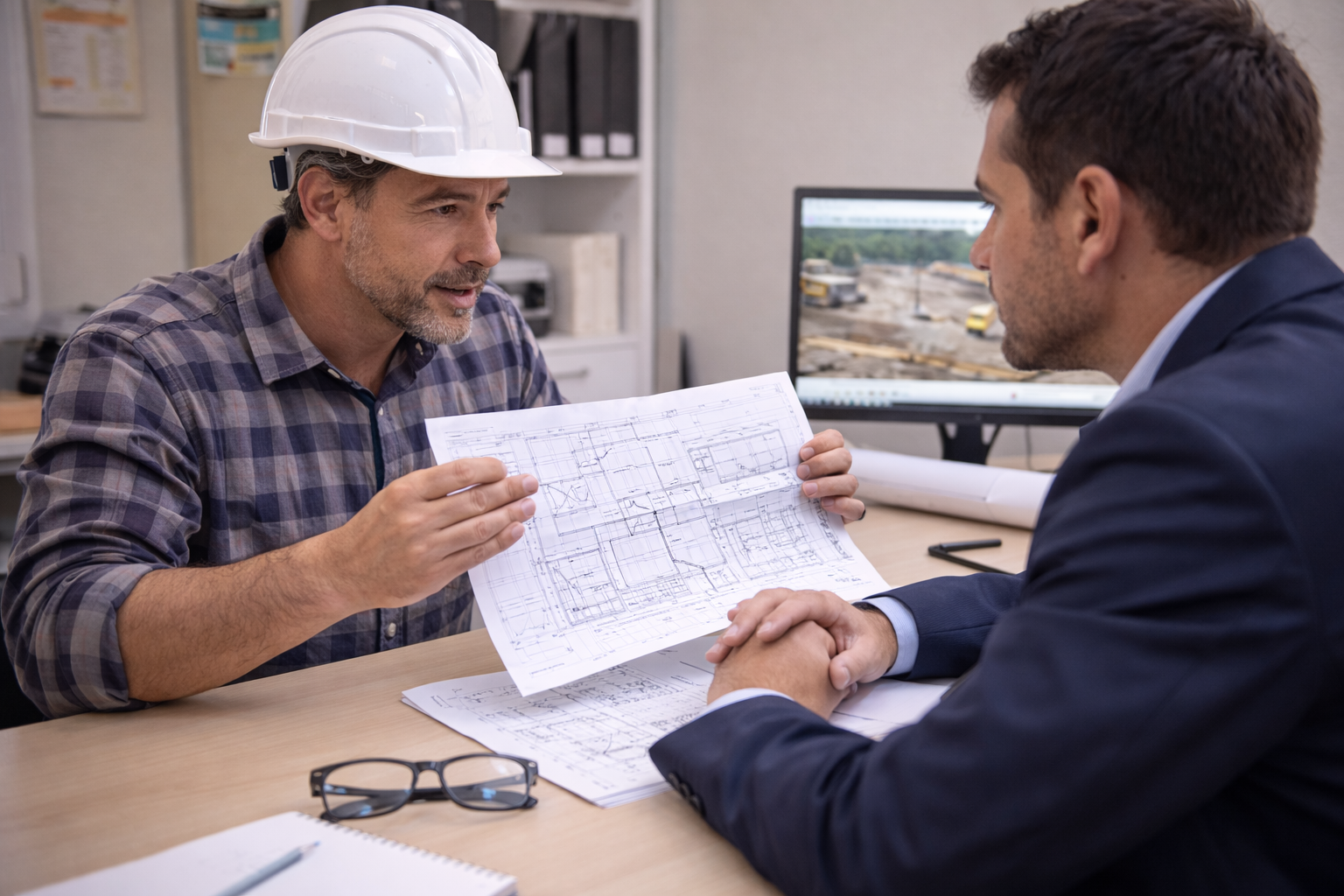 Un conducteur de travaux valide une décision après avoir consulté un chef d’équipe expérimenté.