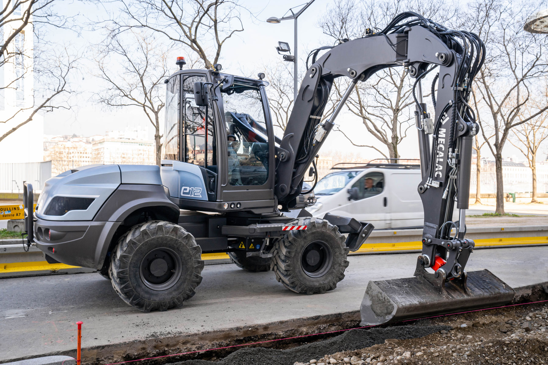 Sur ce segment, la compacité reste essentielle. Une pelle à pneus électrique doit pouvoir conserver un gabarit adapté aux environnements contraints, aux interventions en voirie et aux chantiers urbains. L’électrification n’a d’intérêt que si elle ne dégrade pas la capacité de la machine à travailler dans des espaces resserrés.