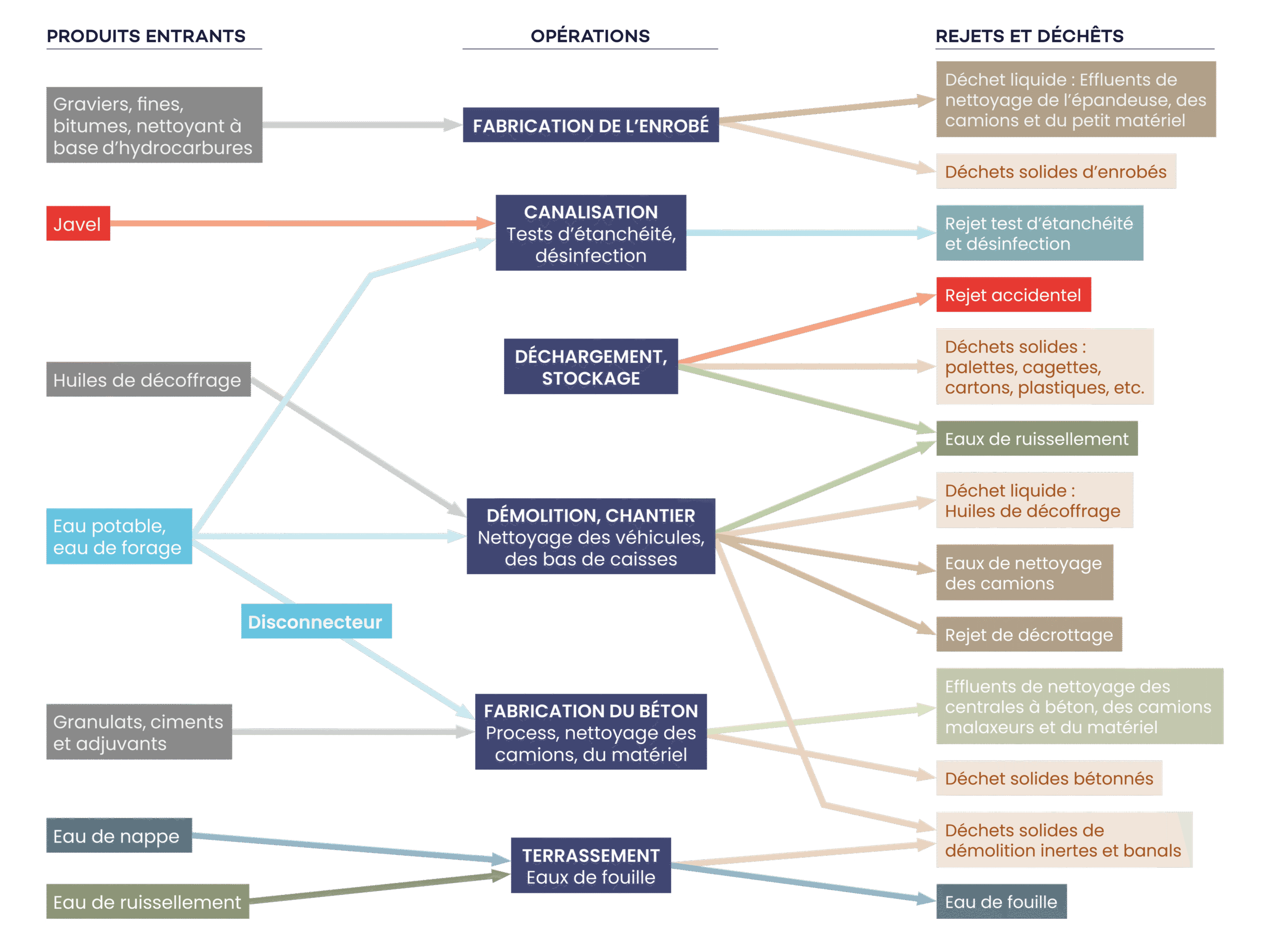 | Effluents de chantier | Gérer en fonction des types d’effluents (voir fiche “Les effluents de chantier de TP”) Aucun rejet dans le réseau d’assainissement ou le milieu naturel ne peut être fait sans autorisation préalable du gestionnaire |