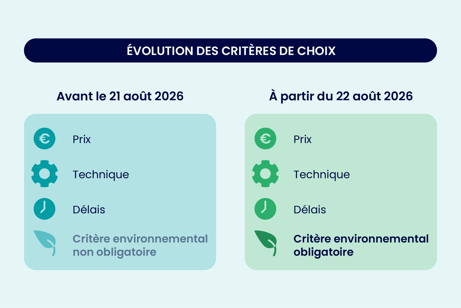 A compter du 21 août 2026, l’acheteur aura l’obligation de prévoir au moins un critère de choix prenant en compte les caractéristiques environnementales de l’offre.