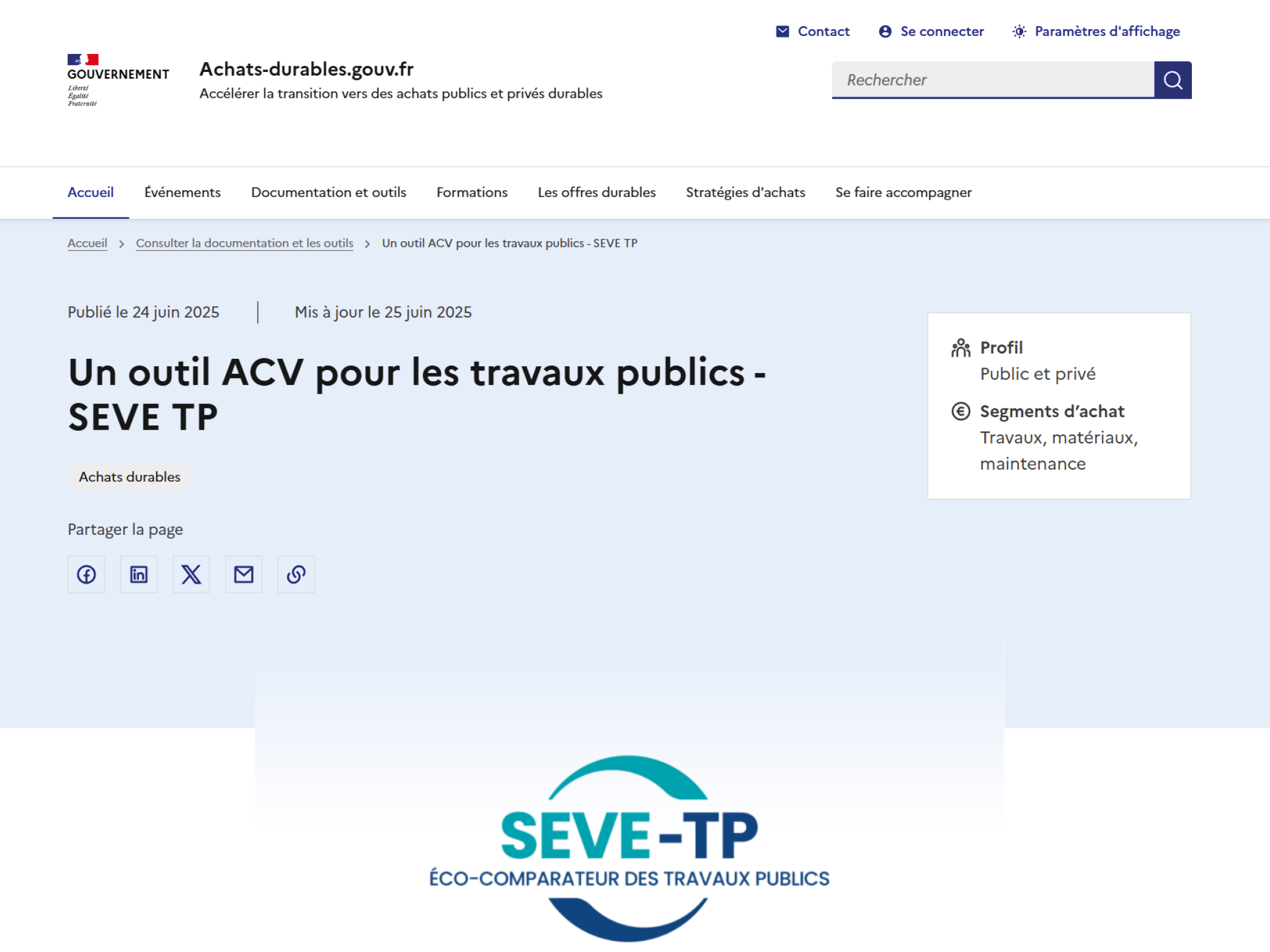- Reconnu par les acteurs de la commande publique, SEVE-TP est mentionné dans certains marchés et figure comme outil de référence sur la plateforme du gouvernement dédiée aux achats responsables : achats-durables.gouv.fr.